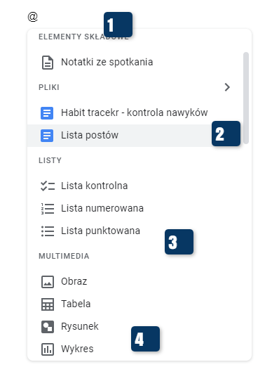 Wystarczy, że wpiszemy w dokumencie przysłowiową małpę – @.  Po wpisaniu tego symbolu rozwinie się wzmiankowana lista. Korzystanie z niej możesz ułatwić sobie wpisując odpowiednie słowa zaraz za „małpą”.