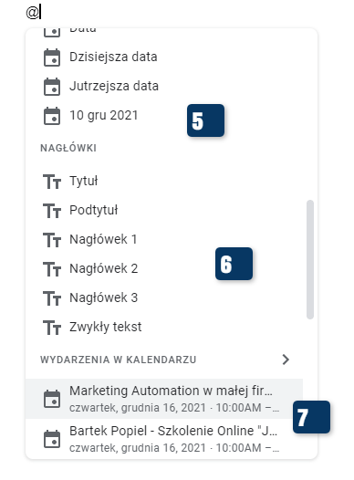 Fragment listy rozwijalne, jak pojawia się po wpisaniu znaku @.