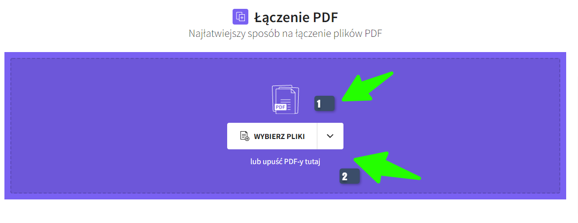 - Wybierz pliki, które chcesz połączyć (Wybierz plik 1) lub przeciągnij (2) przygotowane dokumenty PDF na to fioletowe(?) pole.