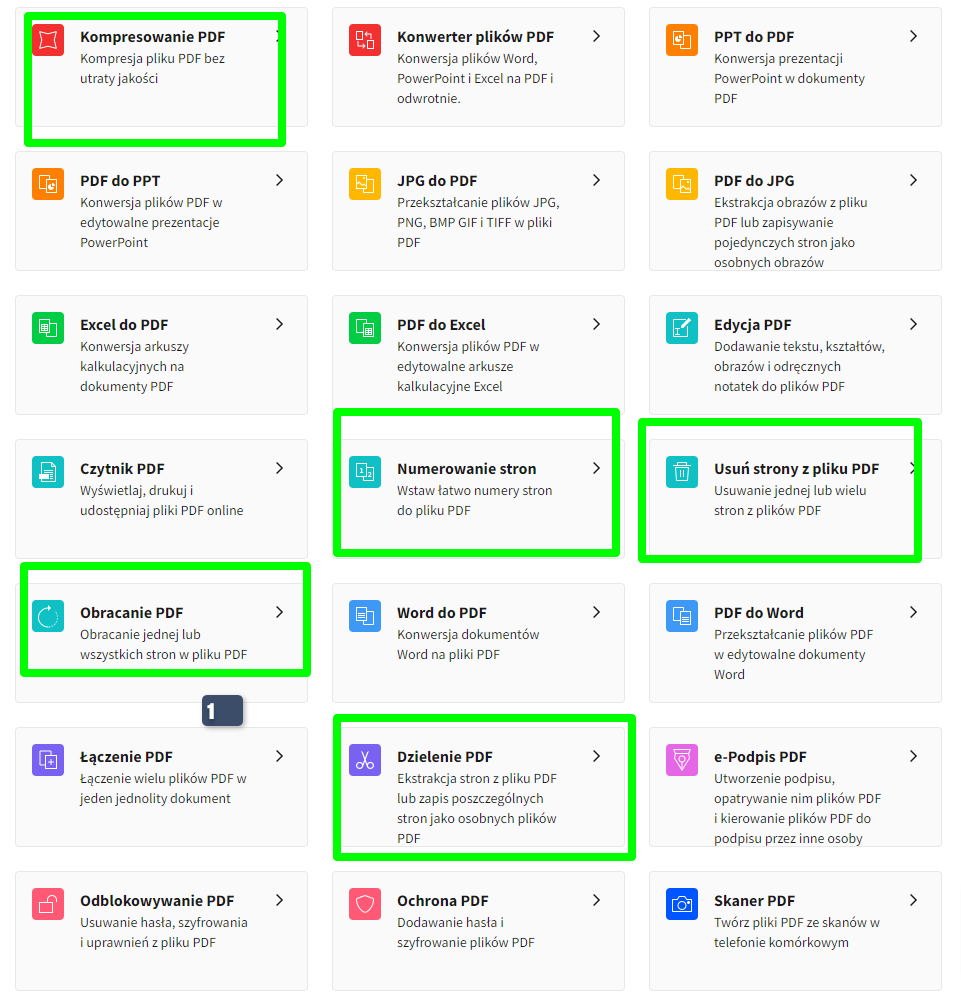 Na stronie głównej aplikacji zjedź na dół strony, aby znaleźć listę najczęściej wykorzystywanych na stronie narzędzi:
